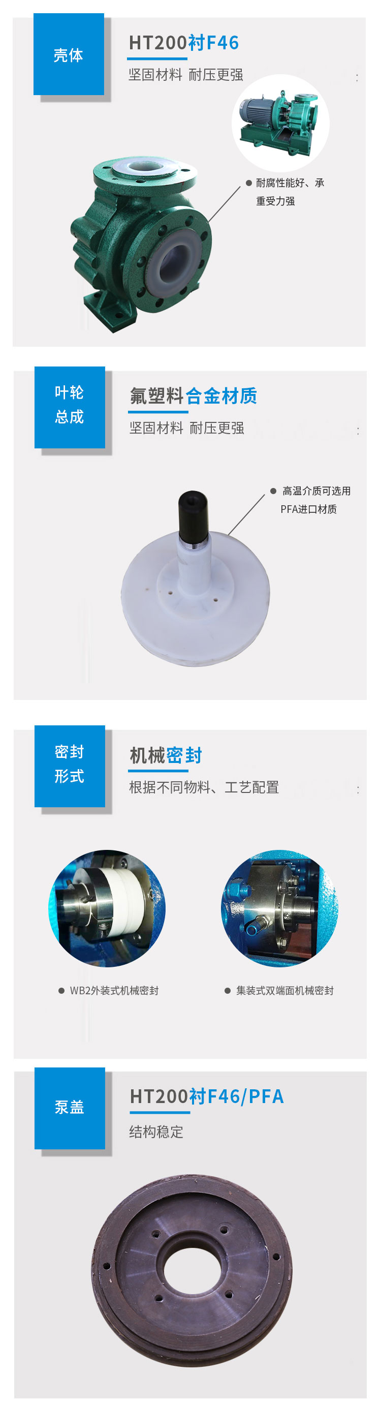 IHF(D)型離心泵是IHF型離心泵的派生產品,是為滿足IHF離心泵性能要求同時受工作場地限制而研制的產品。所有過流部件均采用氟塑料或氟塑料合金制造,耐腐蝕范圍廣;基體采用金屬制造,承壓能力強;軸封采用先進的WB2型外裝式波紋管機械密封,密封性能可靠;采用短支架直連結構,葉輪軸與電機軸采用可靠的莫氏錐度傳遞扭矩,泵機占地面積小。